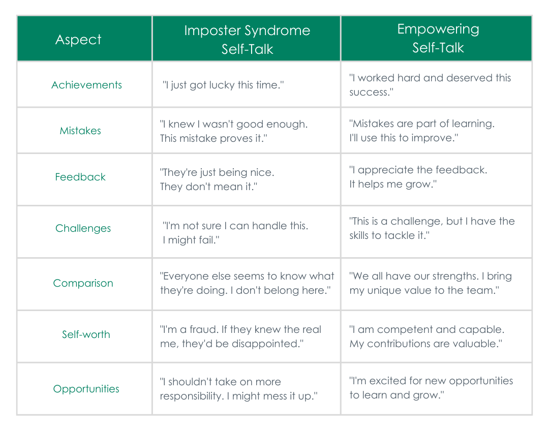 Challenging and reframing negative thoughts is essential in overcoming Imposter Syndrome. Instead of letting self-doubt take over, you can counter these thoughts with evidence of your achievements and capabilities.